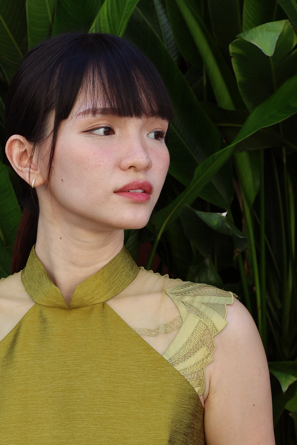 A stunning piece that seamlessly blends timeless sophistication with modern touches, this cheongsam embodies the perfect balance between classic and contemporary. The delicate lace panel at the shoulder introduces a refined, romantic detail, elevating the design with an elegant touch that never overwhelms the overall silhouette.