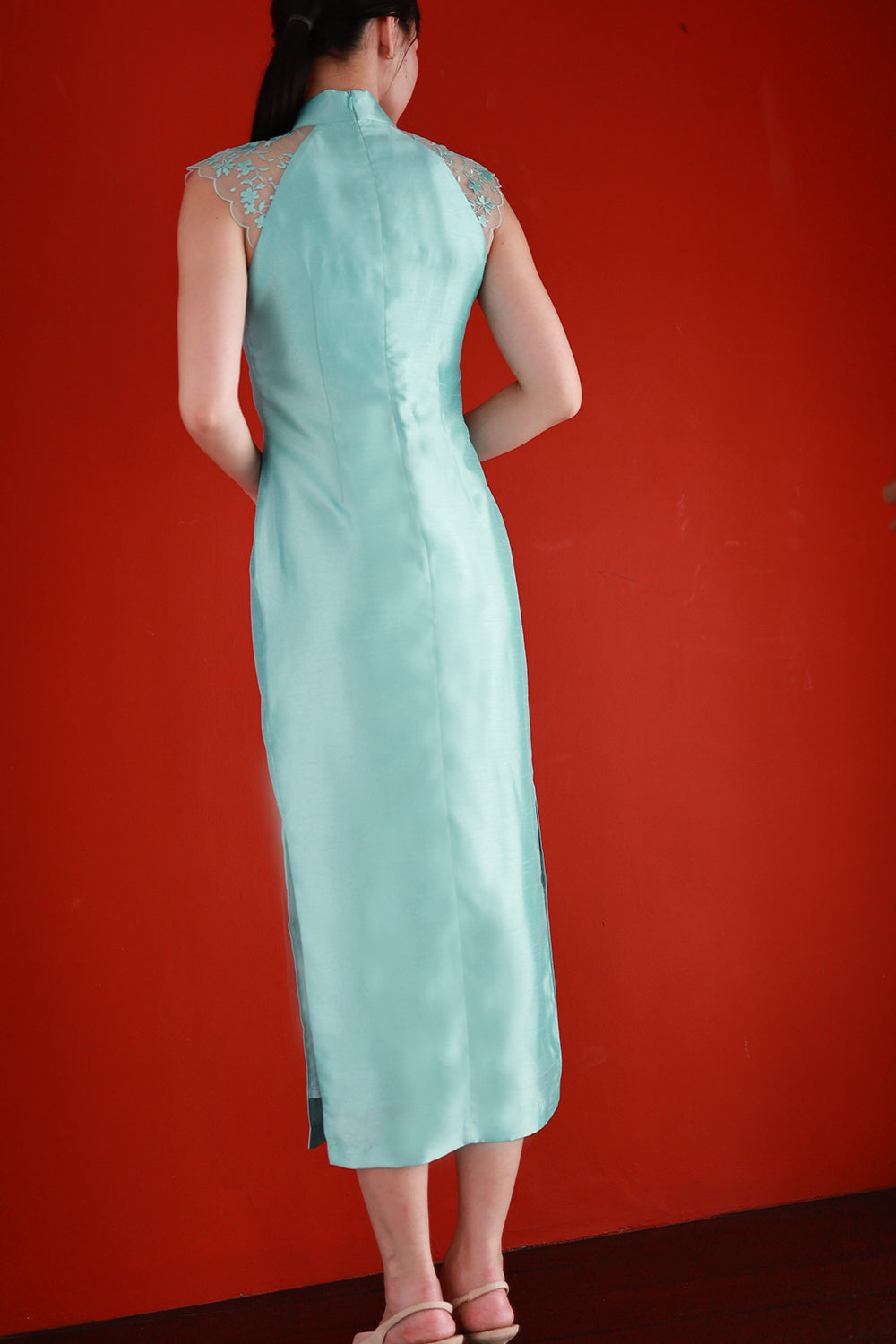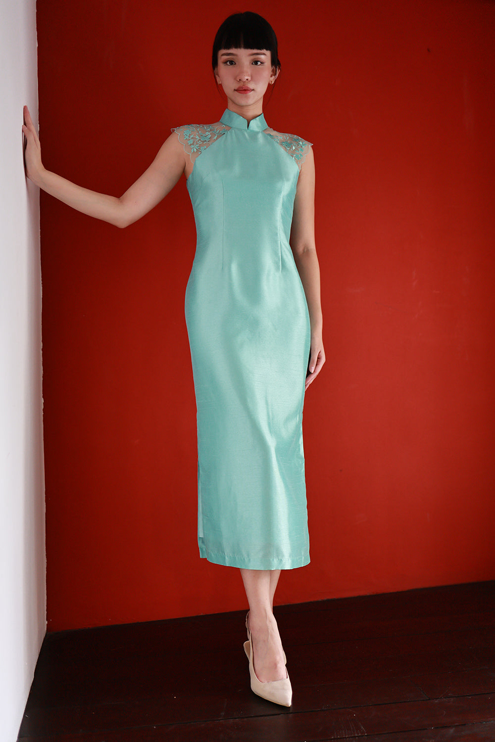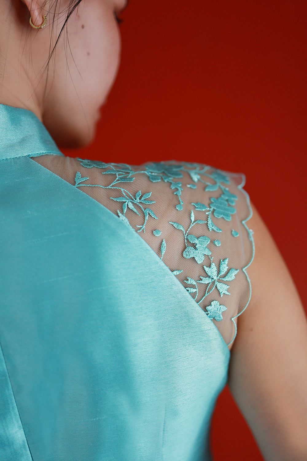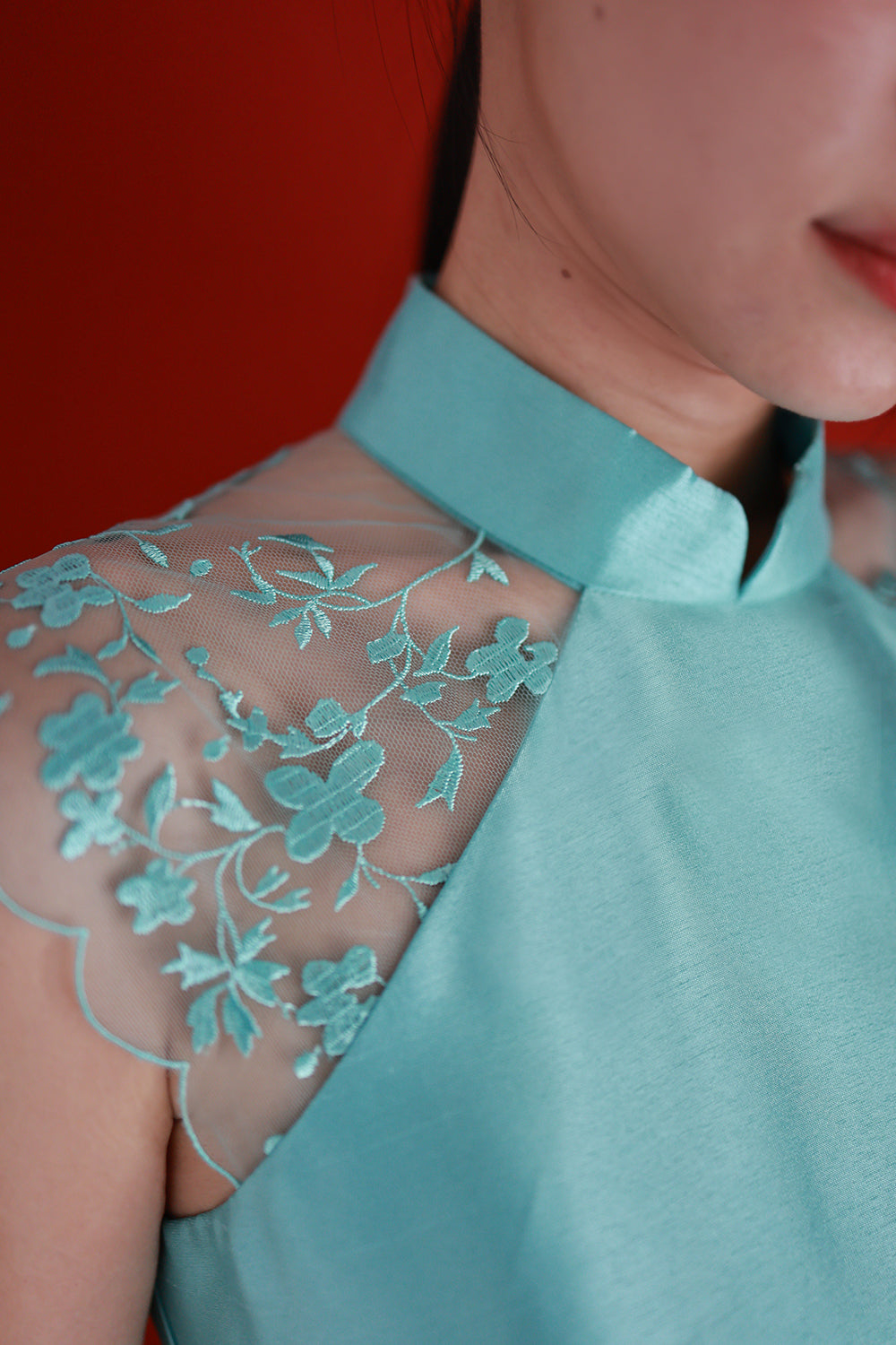 A stunning piece that seamlessly blends timeless sophistication with modern touches, this cheongsam embodies the perfect balance between classic and contemporary. The delicate lace panel at the shoulder introduces a refined, romantic detail, elevating the design with an elegant touch that never overwhelms the overall silhouette.