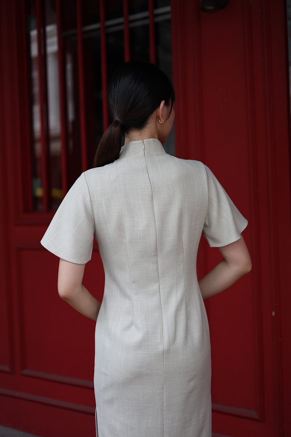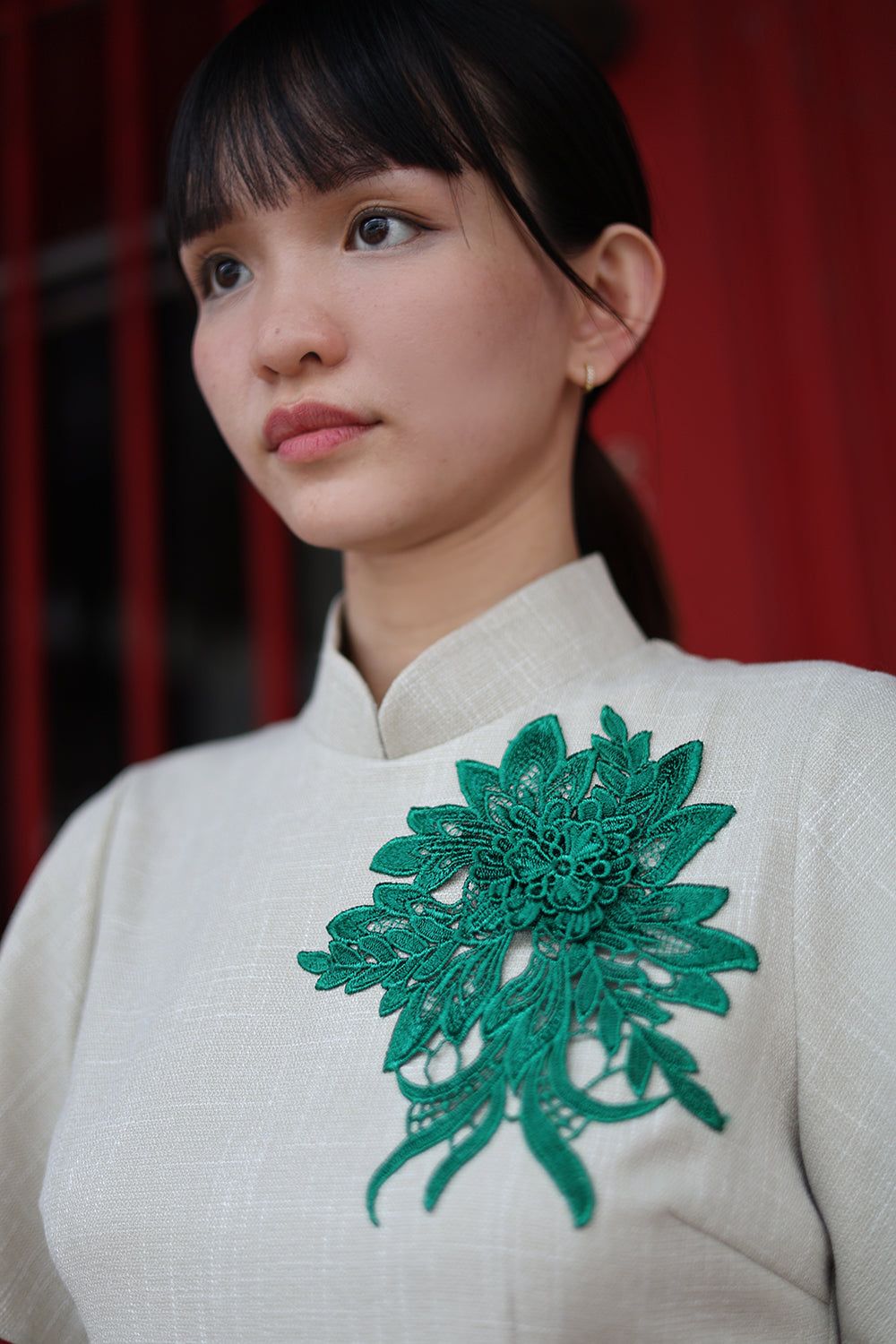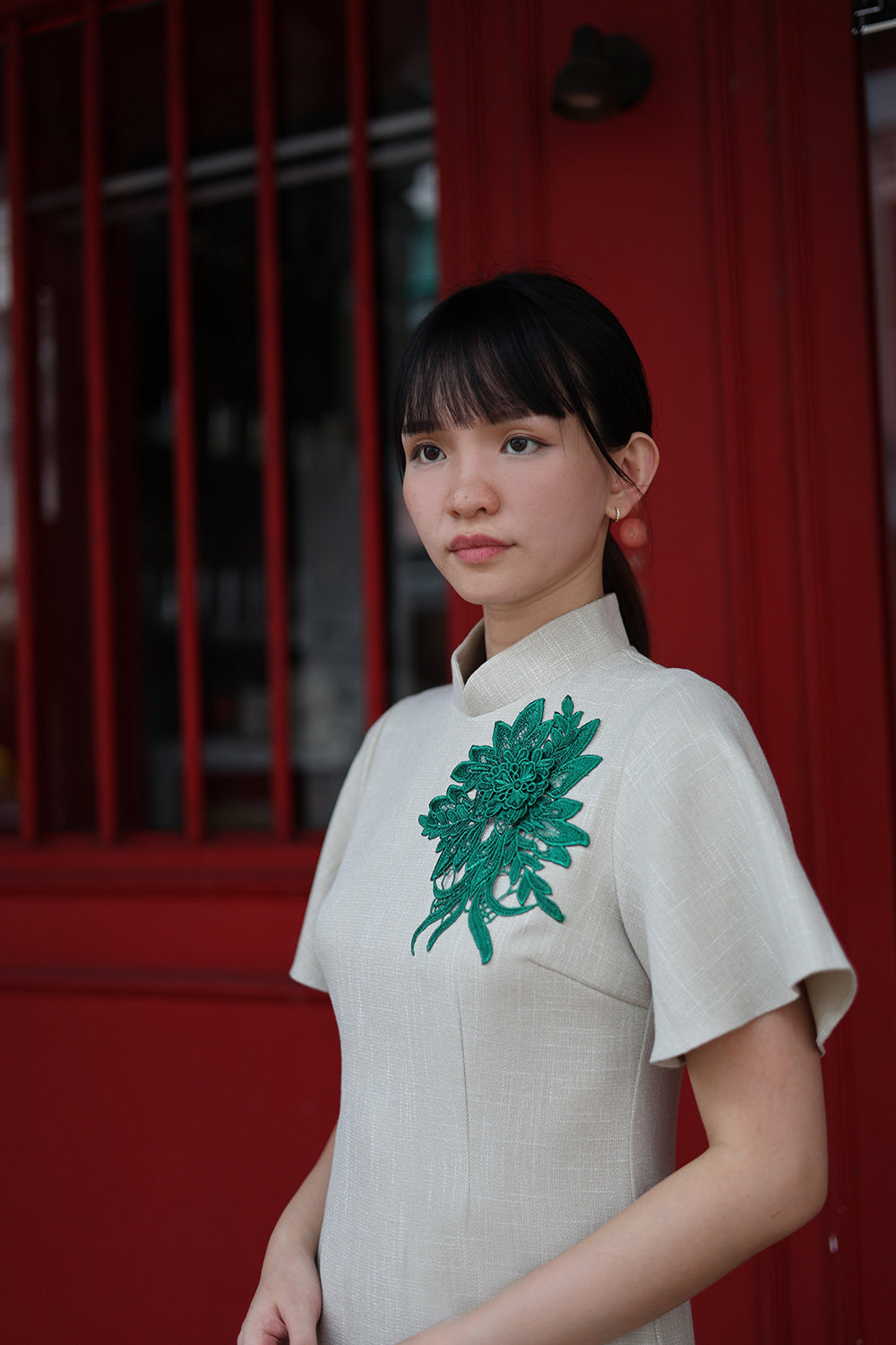 A beige fitted cheongsam, simple yet sophisticated, tailored to flatter with its timeless silhouette. Bold green embroidery weaves across the fabric, creating a striking contrast that brings the dress to life. A perfect example of the quiet magic a classic cheongsam can offer — effortless, cool, and unforgettable.