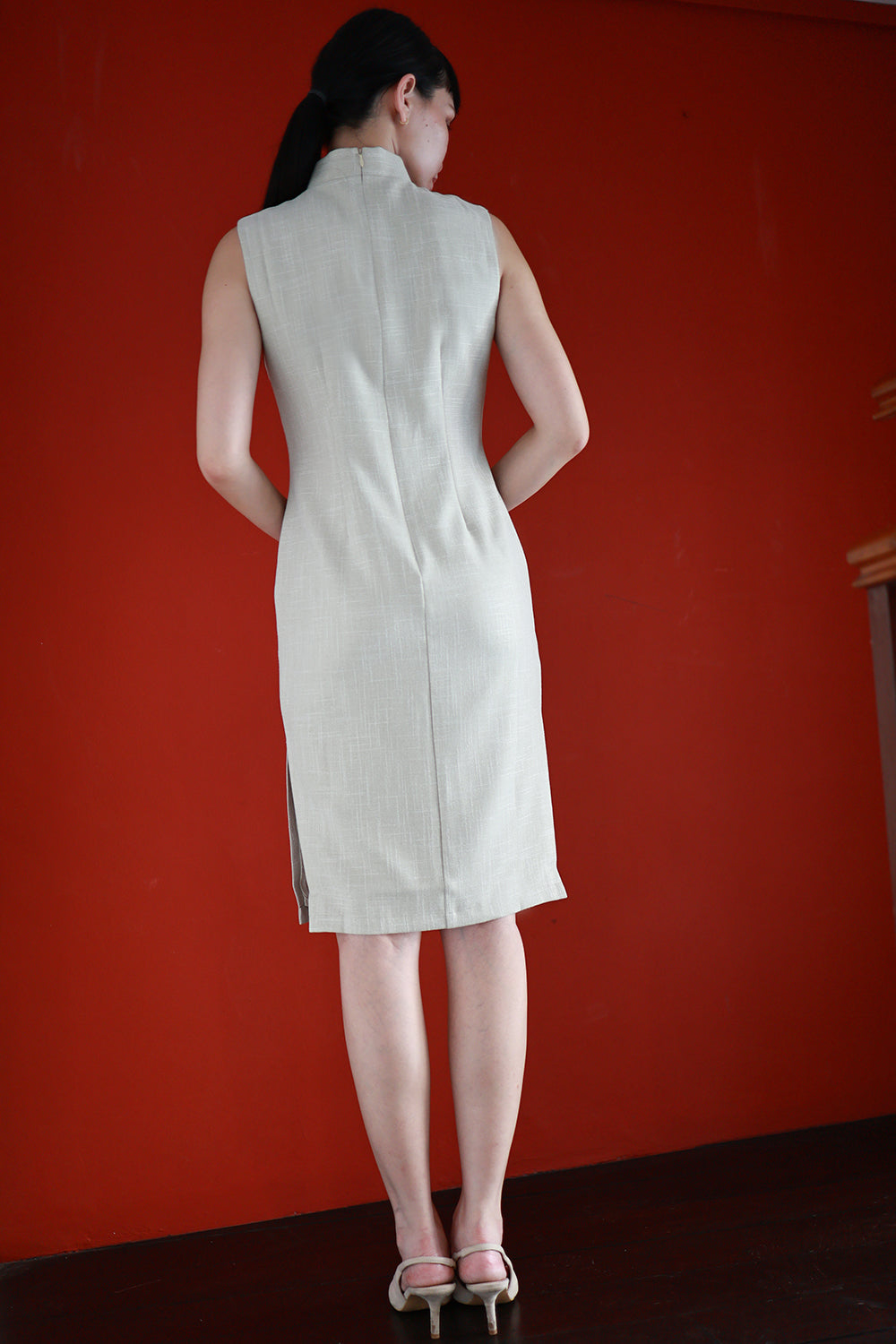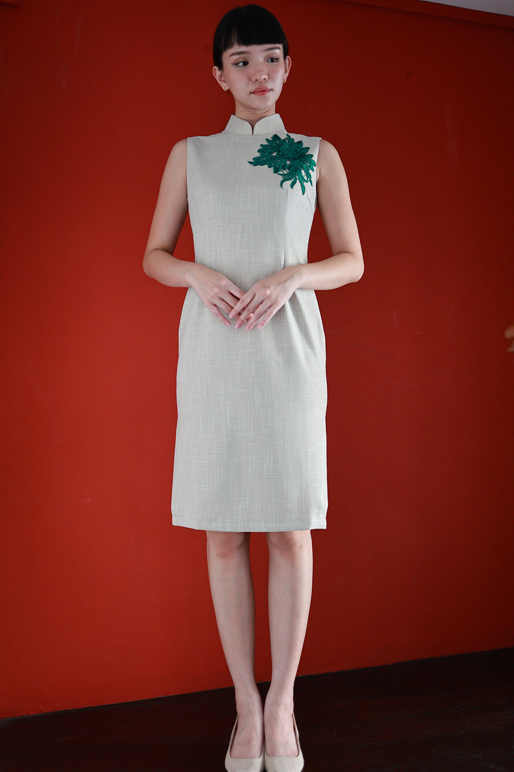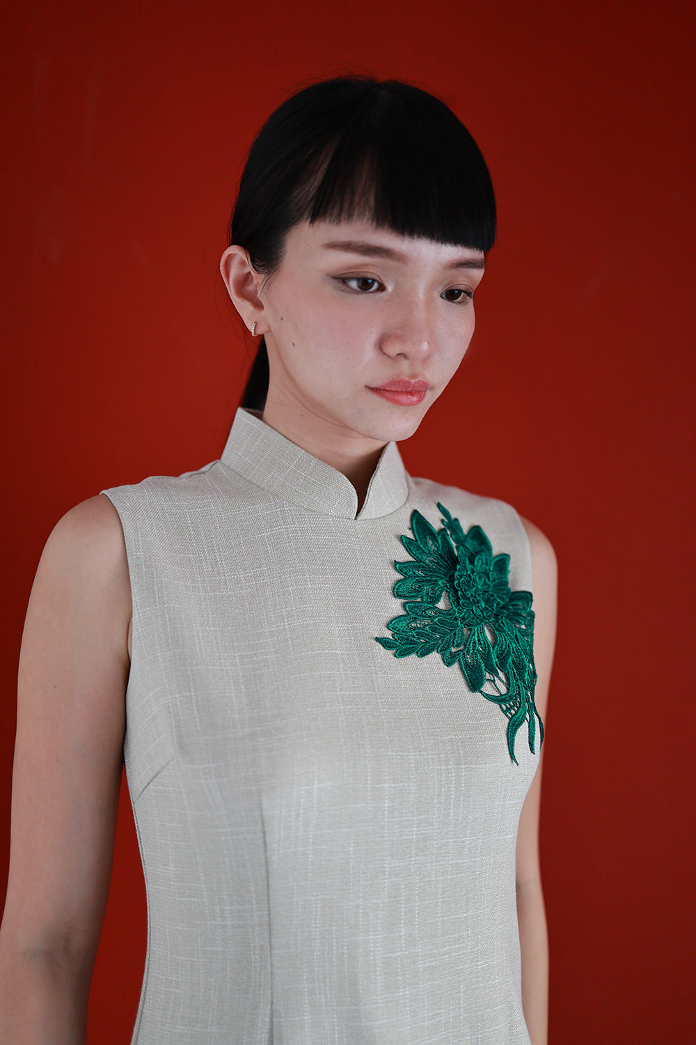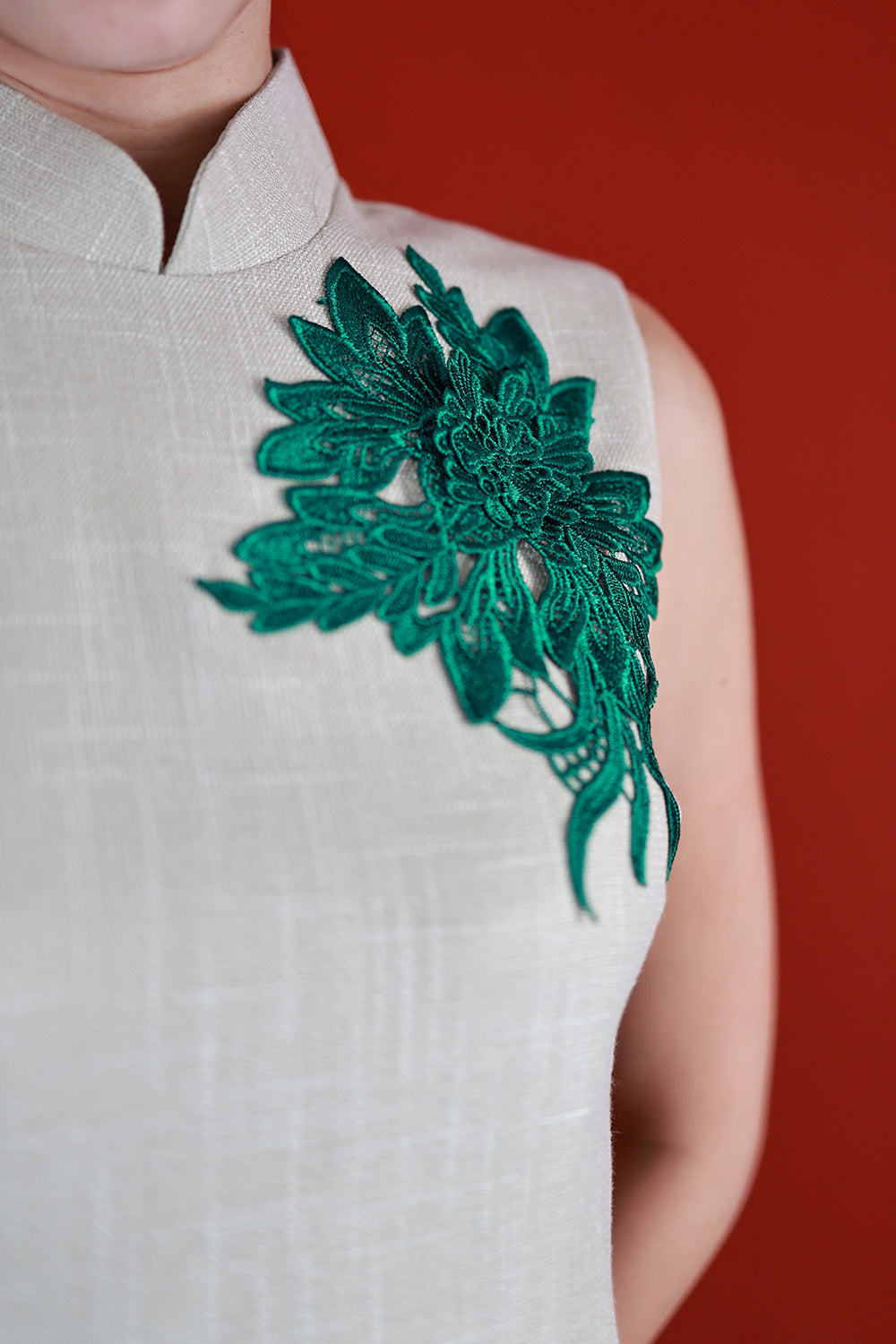 A beige fitted cheongsam, simple yet sophisticated, tailored to flatter with its timeless silhouette. Bold green embroidery weaves across the fabric, creating a striking contrast that brings the dress to life. A perfect example of the quiet magic a classic cheongsam can offer — effortless, cool, and unforgettable.