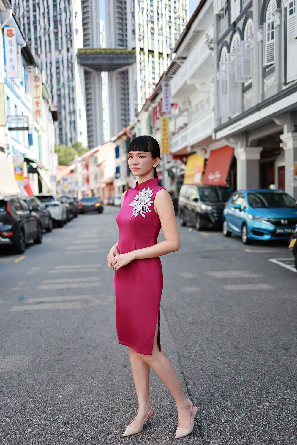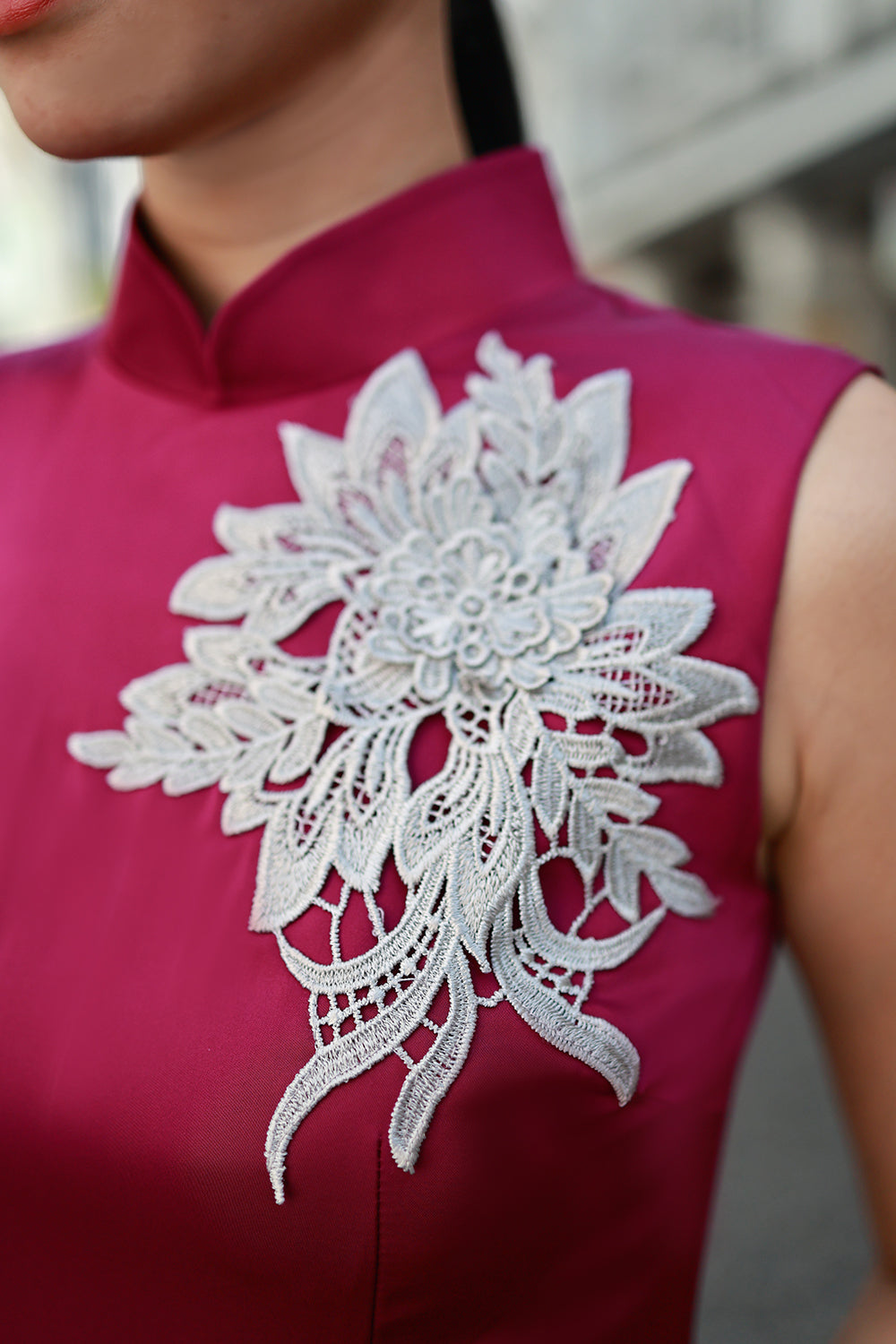 A maroon fitted cheongsam dress, rich and deep in hue, crafted from flowing satin that catches the light with every graceful movement. A silver embroidery glimmers across the dress, adding a striking contrast to the deep, elegant hue — a perfect blend of tradition and modern glamour.