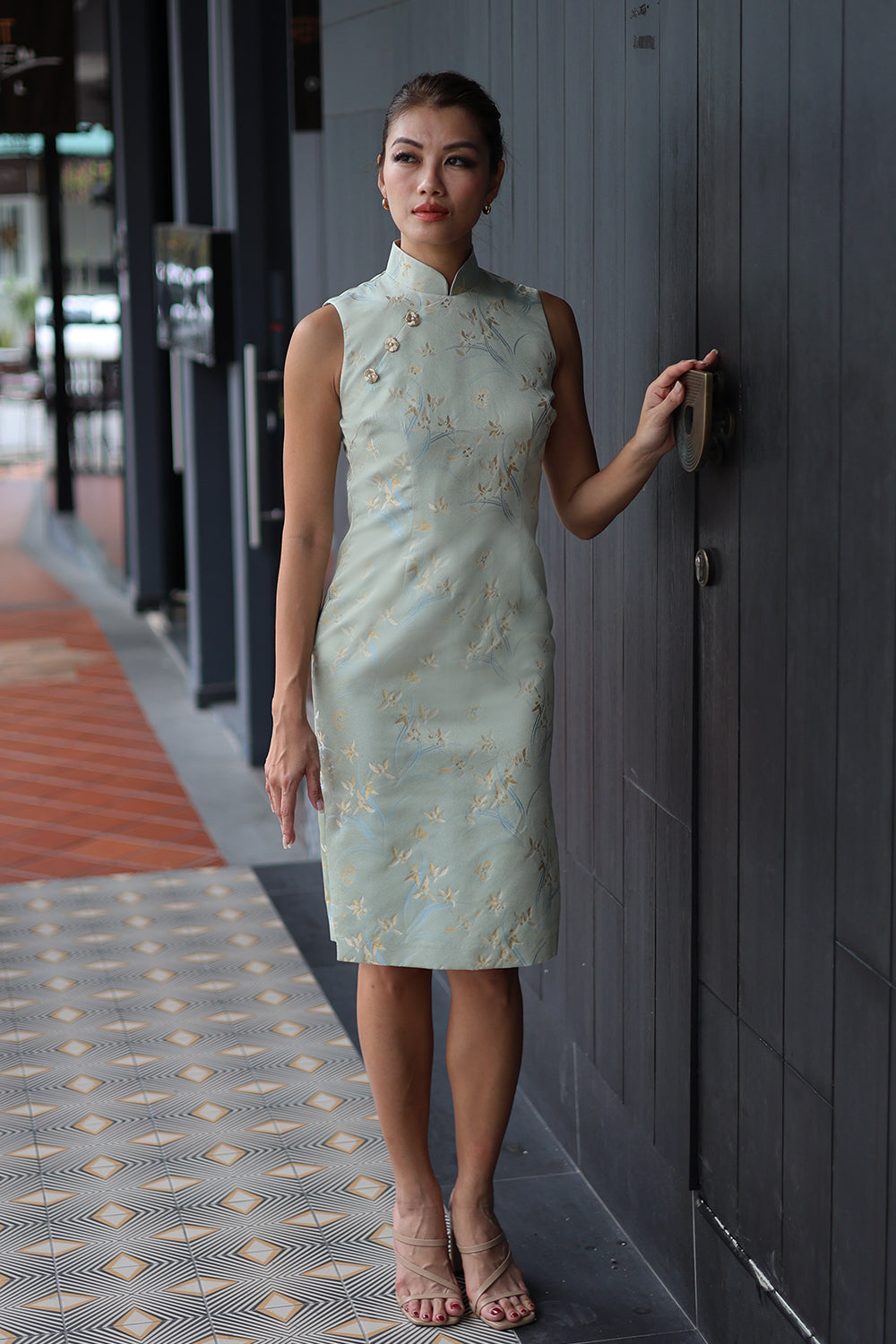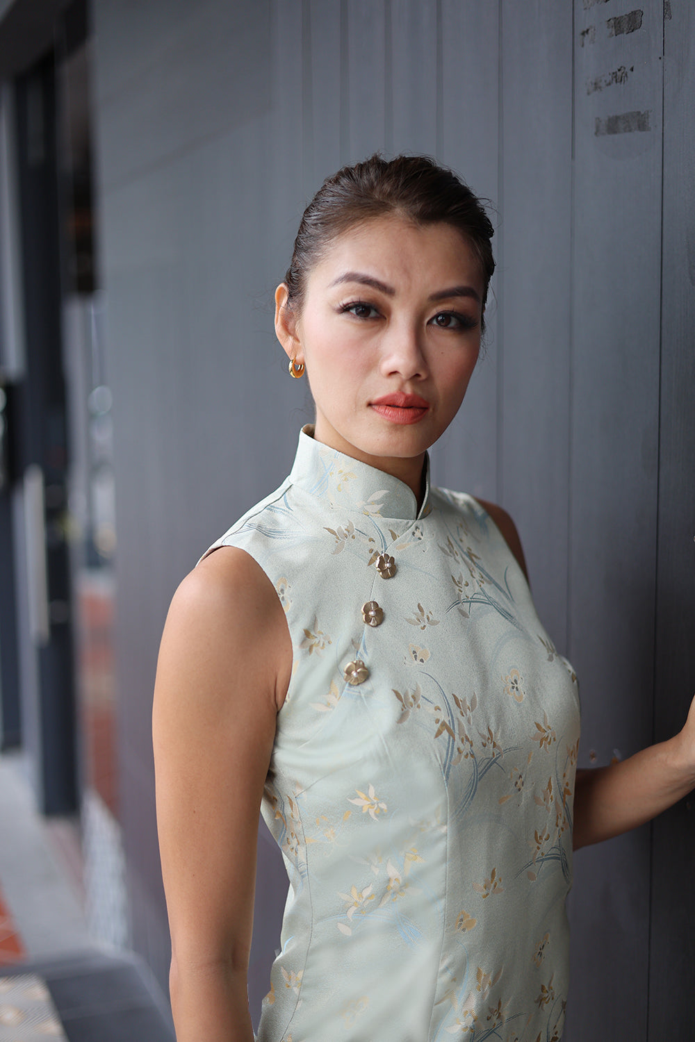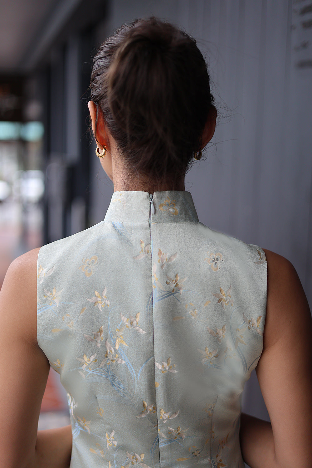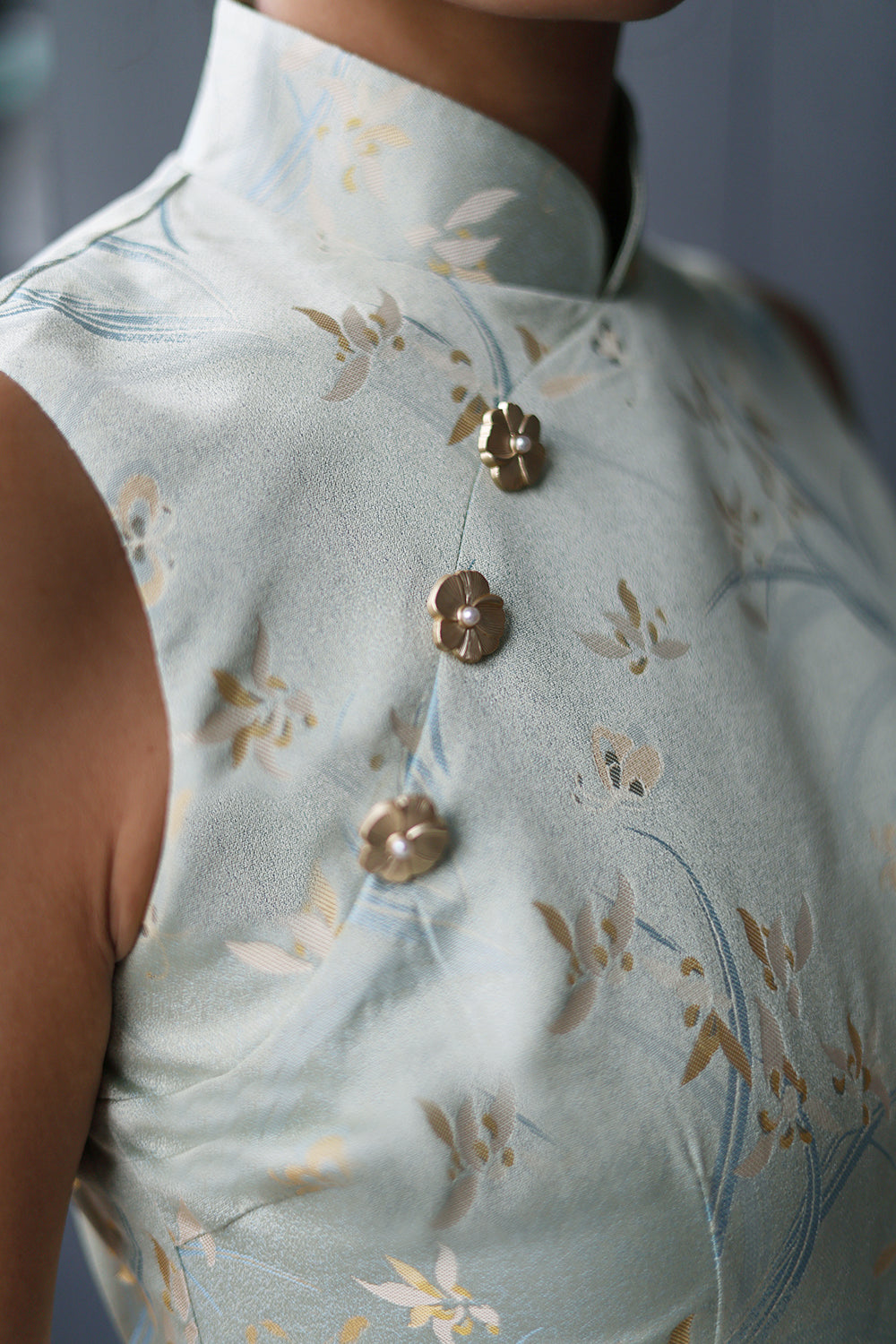 A light blue cheongsam adorned with delicate floral and abstract patterns, inspired by traditional motifs — offering a look that is both neat and effortlessly elegant.