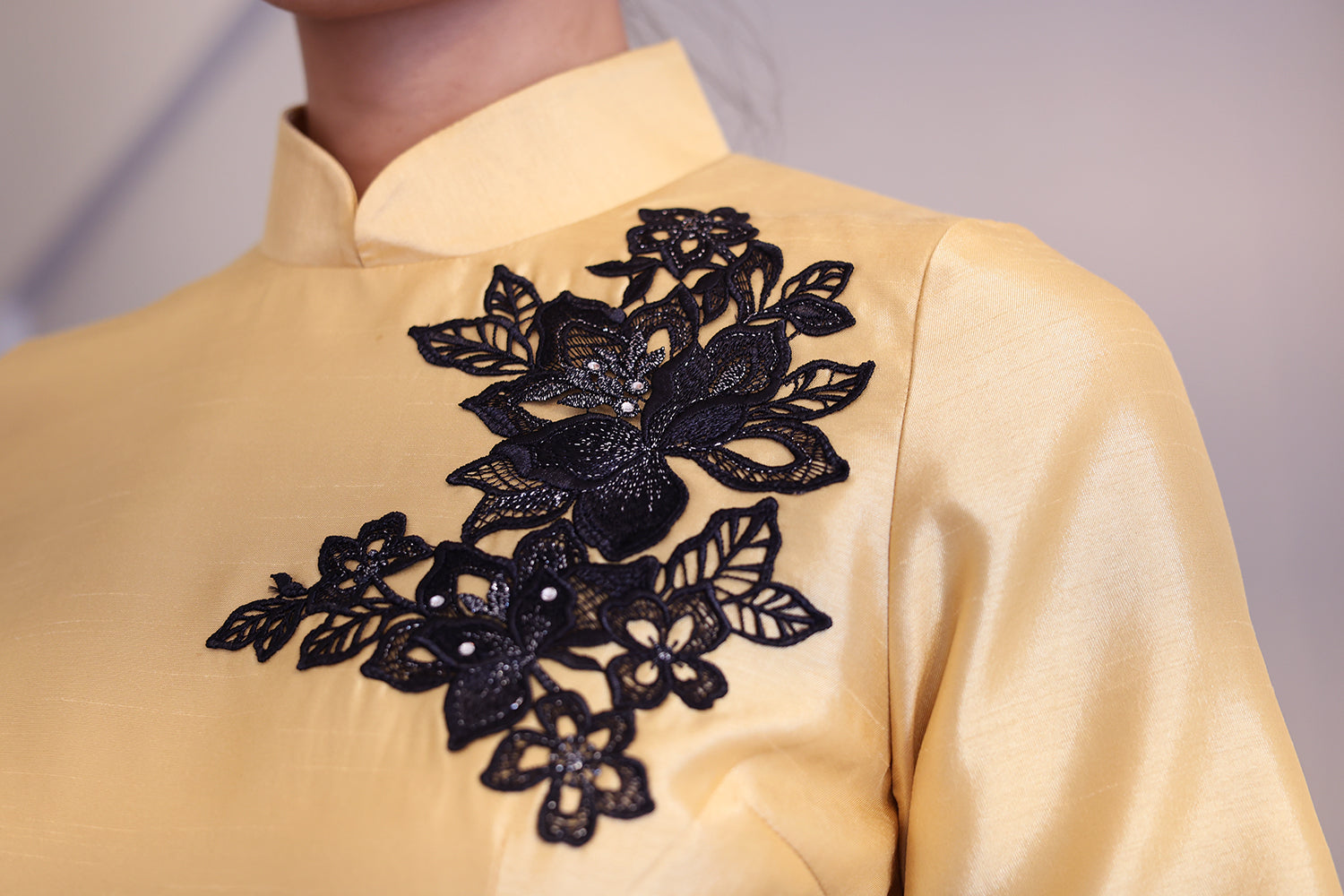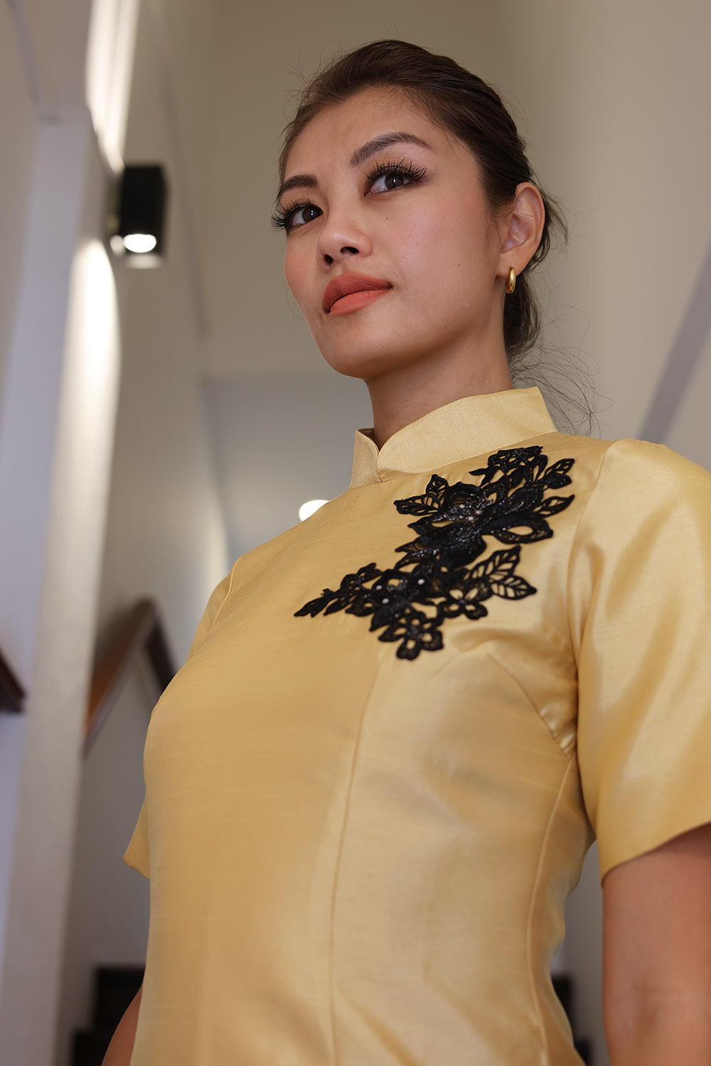 This black and gold cheongsam is a show-stopping piece, perfect for evening galas, high-end events, or anyone looking to make a powerful fashion statement. It combines traditional elegance with modern glamour, ensuring the wearer commands attention.